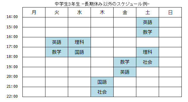 部活が終わった3年生の場合には、受験に向けて、通い放題コースにて週に4回から5回通うことをお勧めします。 長期の休みには、季節講習として一日に5教科(5時間)を10日ほど組み込むことが可能です。通い放題コースは講習費込みです。